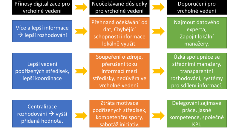 Digitalizace ve smyslu přetváření a zpracování dat na informace pomocí analýz, grafů a modelů,[1] s sebou přináší nebezpečný fenomén, kterému budeme říkat Iluze efektivní centralizace. Vrcholní manažeři totiž digitalizaci vnímají jako příležitost díky kvalitnějším datům organizaci centralizovat, ještě aktivněji se zapojit do strategických činností svých podřízených, převzít a zkvalitnit rozhodovací proces a tím své organizaci přinést ještě větší hodnotu.[2] Naopak ze středních a funkčních manažerů se v tomto pojetí postupně stanou jen prostí operativci a vykonavatelé strategických rozhodnutí.