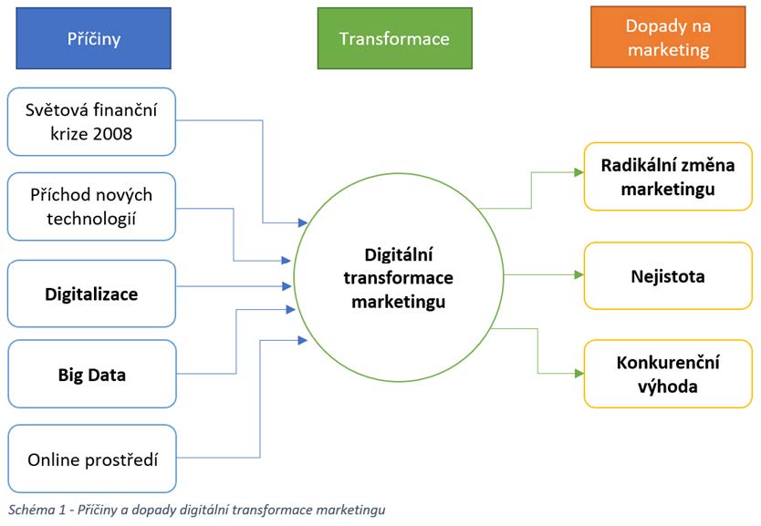 Je velmi zajímavé zamyslet se nad faktory, které vedly k Digitální transformaci marketingu, a nad dopady, které tato dramatická transformace pro marketing v praxi má (viz Obrázek I).[1]