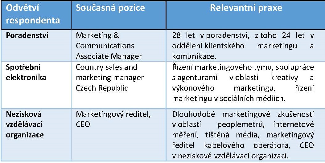 Vzhledem k výzkumným otázkám jsme se rozhodli oslovit tři zkušené respondenty ze zcela odlišných odvětví (viz Tabulka I), u kterých lze očekávat různou úroveň digitální zralosti i zcela odlišný přístup k digitální transformaci marketingu. Na základě hloubkových rozhovorů a srovnání všech tří firem jsme se potom pokusili odpovědět na tři klíčové otázky: