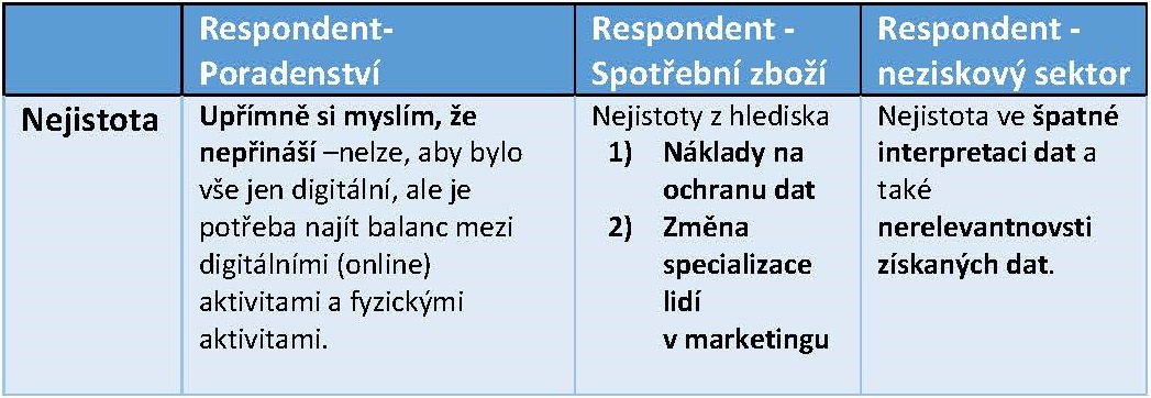 Naopak, pro naše respondenty jsou nové zdroje nejistoty spíše „business as usual.“ A když už nové nejistoty vidí, považují je za snadno řešitelné: správná rovnováha mezi online a offline aktivitami, riziko nerelevantních nebo špatné interpretovaných dat, dodatečné náklady na ochranu dat, investice do specialistů digitálního marketingu, sázka na špatnou digitální technologii.
