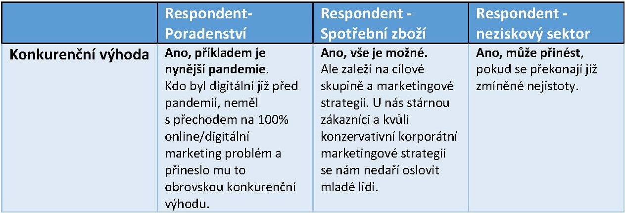 Chaston[5] uvádí, že digitalizace marketingu a především Big Data přináší konkurenční výhodu. A stejně to vidí i všichni tři respondenti, kteří zdůraznili proaktivnost marketingového oddělení a význam promyšlené a vhodně implementované digitální marketingové strategie. Jako odstrašující příklad potom respondenti poukazují na digitálně nepřipravené konkurenty, kteří nedokázali zareagovat na probíhající pandemii a utrpěli značné ztráty.