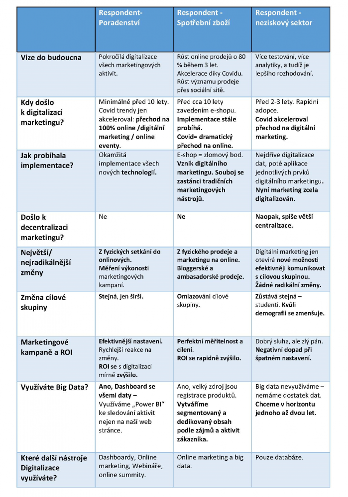 Tabulka II. shrnuje ty nejzajímavější postřehy z oblasti digitální transformace marketingu a současně ukazuje zásadní rozdíly mezi jednotlivými odvětvími. Velmi zajímavé je třeba srovnání, kdy digitalizace do marketingu v jednotlivých odvětvích „vtrhla.“ Zatímco v poradenství a ve spotřebním zboží se začala digitalizace masívně prosazovat již před deseti lety, v kontextu vzdělávací neziskové organizace došlo k digitální marketingové revoluci teprve před přibližně třemi lety.