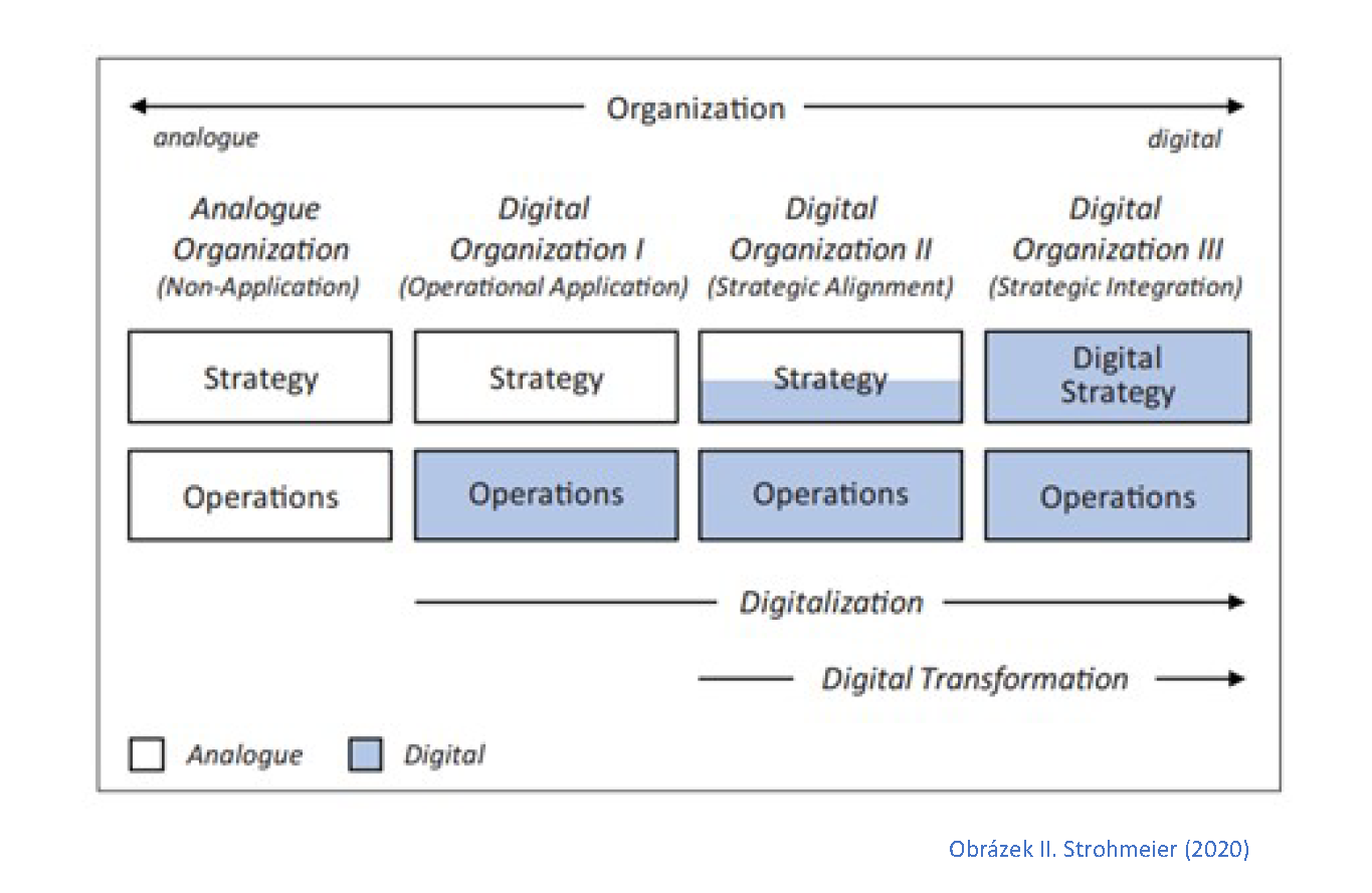 Velmi kvalifikovaně a názorně se s novou digitální terminologií vypořádal třeba prof. Strohmeier.[19] Jeho Typologie digitální organizace je pochopitelná na první pohled (viz obrázek): (1) na horním okraji vidíme kontinuum digitální organizace, (2) čtyři úrovně jsou jasně pojmenovány (Neexistující – Operační – Strategické sladění – Strategická integrace), (3) vidíme rozdíl a zapojení operativní- strategické a digitálně strategické úrovně, a (4) přehledně vidíme překrývání Digitalizace a Digitální transformace.